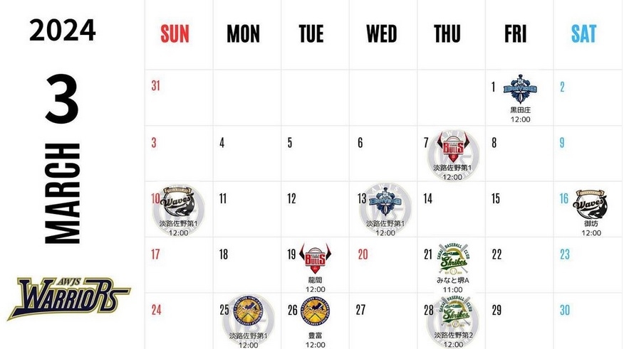 3月10日(日)12:00 vs 和歌山ウェイブス 淡路佐野運動公園第1野球場